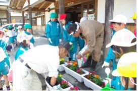 今年度も全校で花や農作物を育て「命」の大切さを学び、収穫の喜び(食育・キャリア教育)を味わい笑顔満開の学校にしょうと取り組んでいます。今年は、百四十周年を記念してPTAの協力のもと正面玄関に記念花壇を造園しました。 写真右:花植え、下左:サツマイモ植え、下右:田植え