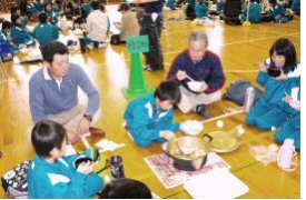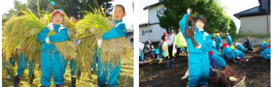 春に子ども達が栄っ子の田や畑に植えたサツマイモや稲を全校で収穫しました。後日、祖父母や地域の皆さんを招待し、新米をおにぎりにし、芋の子汁を作って会食する「収穫感謝祭」を実施し、百四十周年を満腹の笑顔でお祝いしました。