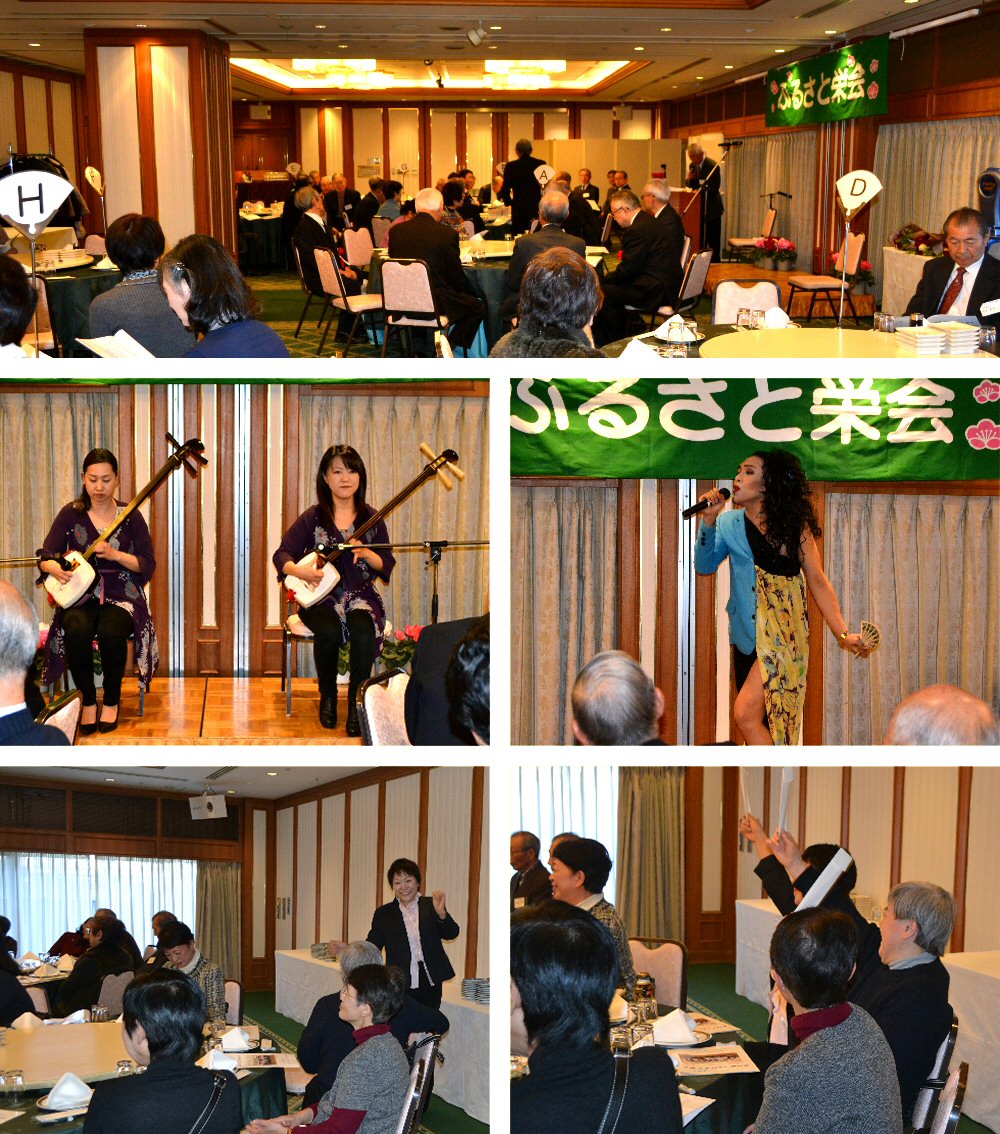 第34回「ふるさと栄会」アルバム第34回「ふるさと栄会」は、平成29年12月17日(日) 11時~16時、アルカディア市ヶ谷私学会館で行われ、会員ご来賓合わせて約70名の参加を得て盛会裏に終了しました。総会に続いて、特別公演として澤田邦羽・邦衣による津軽三味線演奏とアラレノロドルフジュニア(和賀秀夫さんのご縁戚)の飛び入り出演があり、更に懇親会へと雰囲気が盛り上がりました。 特別公演